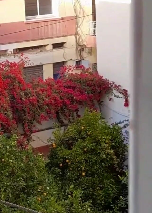 The camera faces a medium-sized building, capturing the top half. A lush display of red bougainvillea flowers cascades over a wall between the building and verdant trees filled with oranges. A banner hangs from the building, slightly obscuring a row of windows. Power lines bisect the view. The scene is static with natural lighting.