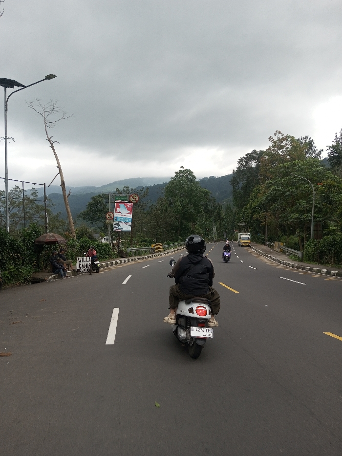 This image depicts a mountainous road scene in Gubbisamamidi, India, under an overcast sky. The primary subject is a person riding a white scooter, observed from behind, traveling away from the viewer in the right lane of a two-lane asphalt road. The rider wears a black helmet, a dark jacket, light pants, and light-colored shoes, with a black backpack. The scooter's license plate, "B 4274 EFD," is visible. To the left of the road, a concrete curb separates the asphalt from a vegetated embankment. A tall metal street light pole with an apparent solar panel and a bare tree trunk stand near the roadside. Beneath a small brown umbrella, three individuals are seated on a low concrete structure. Another person is near a parked dark motorcycle beside a white sign displaying "VILLA KAMAR DISEWAKAN." Further along the left shoulder, several signs are mounted on a pole, including a red and white advertisement and multiple "S" shaped traffic signs. In the distance ahead, another person on a dark scooter travels in the same lane, followed by a yellow truck visible on the far right side of the road. The right side of the road is bordered by a concrete barrier with yellow and black stripes, behind which dense green foliage and trees line the uphill slope. The road itself features a broken white center line and solid yellow lines along the shoulders. Rolling hills covered in lush green forest recede into the background, beneath a uniformly gray, cloud-filled sky.