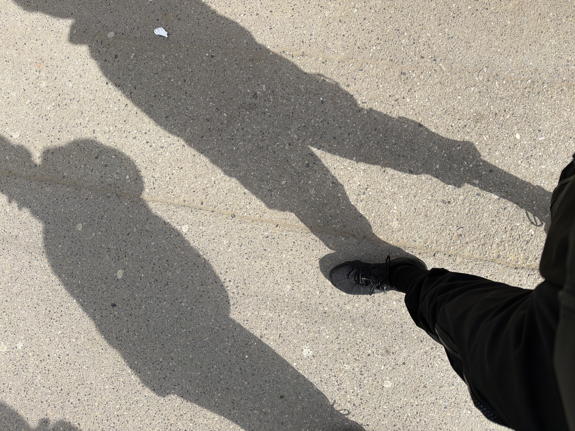 An overhead view captures a segment of light gray, coarse aggregate pavement under direct sunlight. The lower left portion of the frame shows a human left leg and foot, clad in black athletic footwear, black socks, and black trousers. Three distinct human-shaped shadows are cast across the pavement, indicating the presence of at least three individuals and a low sun angle. Minor debris is present on the pavement, including a small crumpled white paper fragment near the upper right shadow and a dark speck centrally located. The scene is located in the city of Sofia, Bulgaria.
