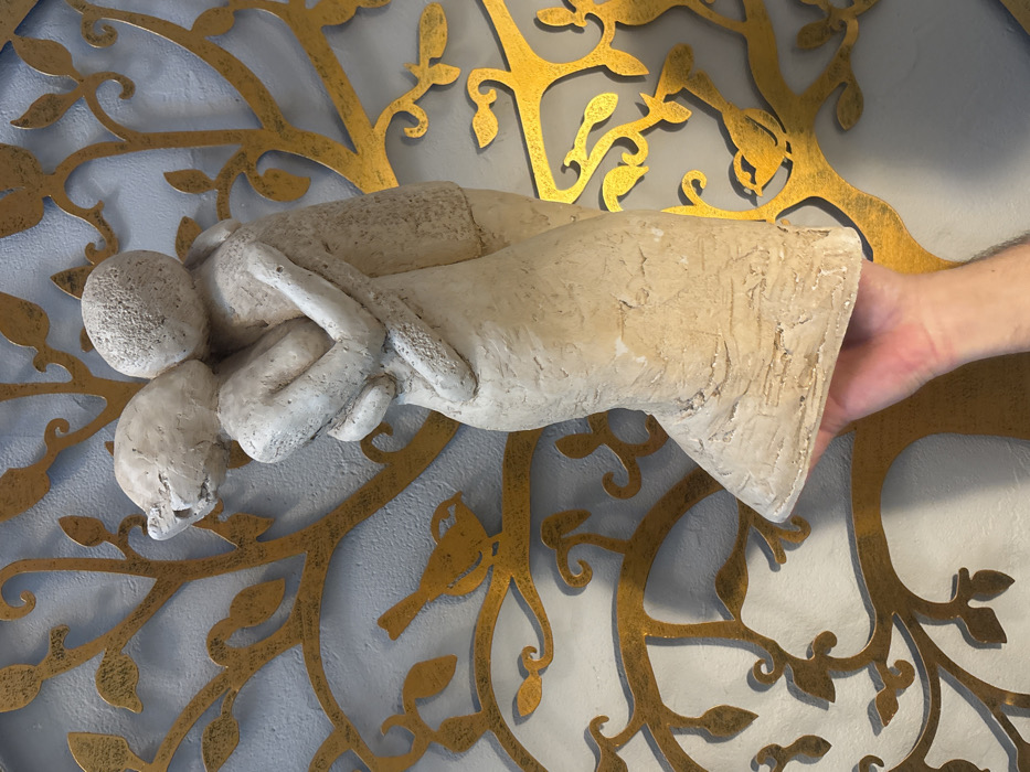 A light-colored, textured sculpture depicting two stylized figures in a close embrace is captured in a close-up view in Esch-sur-Alzette, Luxembourg. The sculpture, rendered in an off-white or beige material with a rough, porous finish, shows a female figure in a long gown leaning into a male figure embracing her from behind. The male figure's left arm is visible wrapped around the female's midsection, while her arms are also around him. The base of the sculpture is supported from below by a human right hand, with fair skin, suggesting it is being held or positioned. In the background, a large, intricate golden metallic "tree of life" wall decoration with numerous branches, stylized leaves, and integrated bird silhouettes is mounted on a light blue-gray, textured wall. Illumination appears consistent, likely from an artificial source, casting subtle shadows and highlighting the textures of the sculpture and the wall decor.