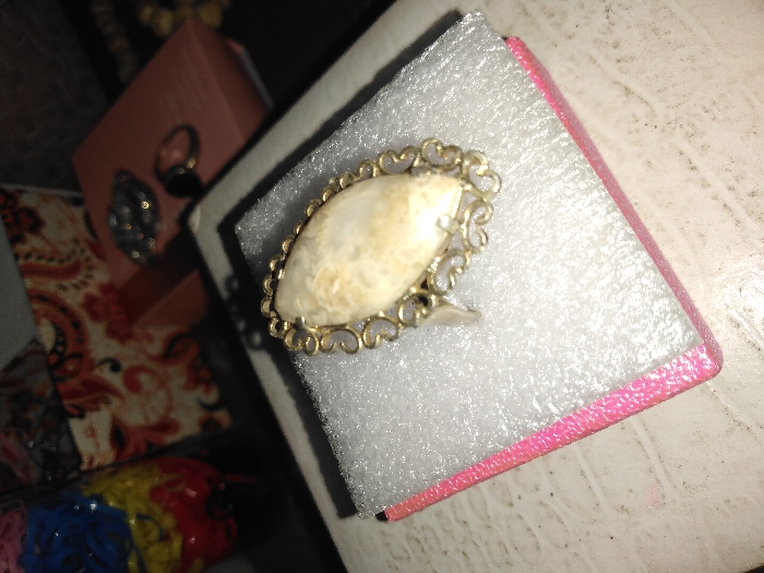 A close-up photograph, taken from a slightly elevated angle, displays a single ring centrally positioned on a white, open-cell foam pad with visible pink edges. The ring features an elongated, off-white, opaque cabochon stone set within an ornate, gold-toned metal bezel adorned with scrollwork. The foam pad rests on a lighter-colored, textured surface, likely a countertop or table. In the upper left background, a colorful container, featuring red, yellow, and blue elements, is partially visible and appears to hold numerous small, multi-colored elastic bands. Adjacent to this, a dark brown box with a light-colored paisley pattern is present. To the right, a reddish-brown rectangular object, possibly a book or another box, supports two additional pieces of jewelry: a dark-colored ring or brooch with multiple reflective elements, and a simpler gold-toned band. The lighting is dim, indicating an indoor setting. The image does not provide any identifiable visual information to determine a specific location within Caracas, Venezuela.