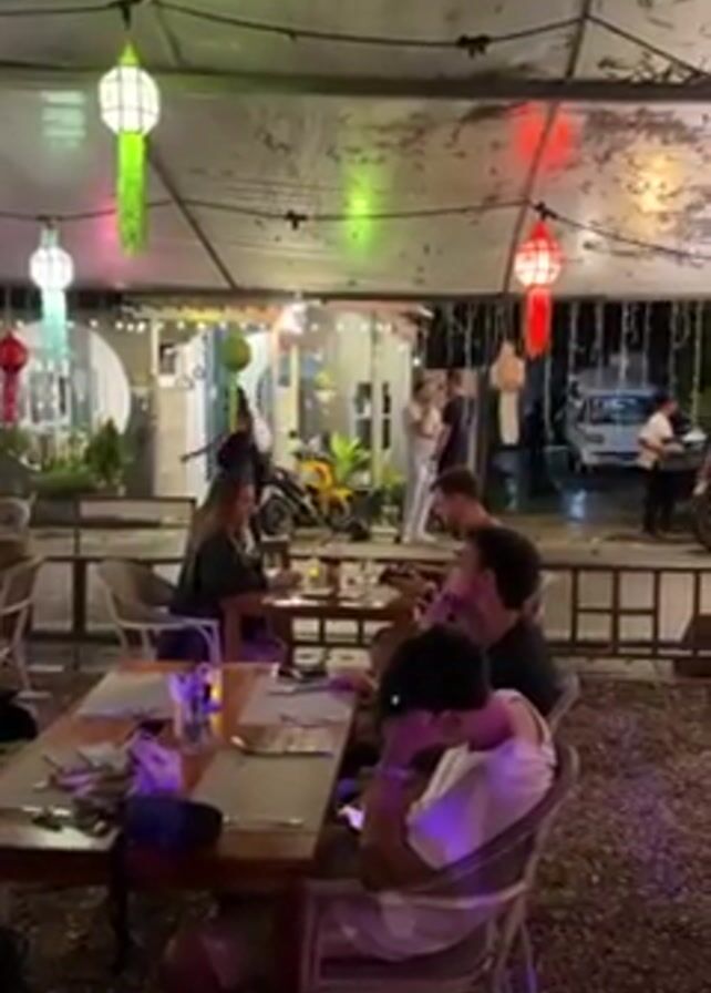 outdoor seating area of a restaurant at night. Several groups of people are seated at tables, eating and conversing. The area is decorated with colorful paper lanterns strung overhead. In the background, a street can be seen with vehicles passing by. The ground is covered in gravel. The camera slowly pans to the right. A server can be seen carrying a tray near the street.