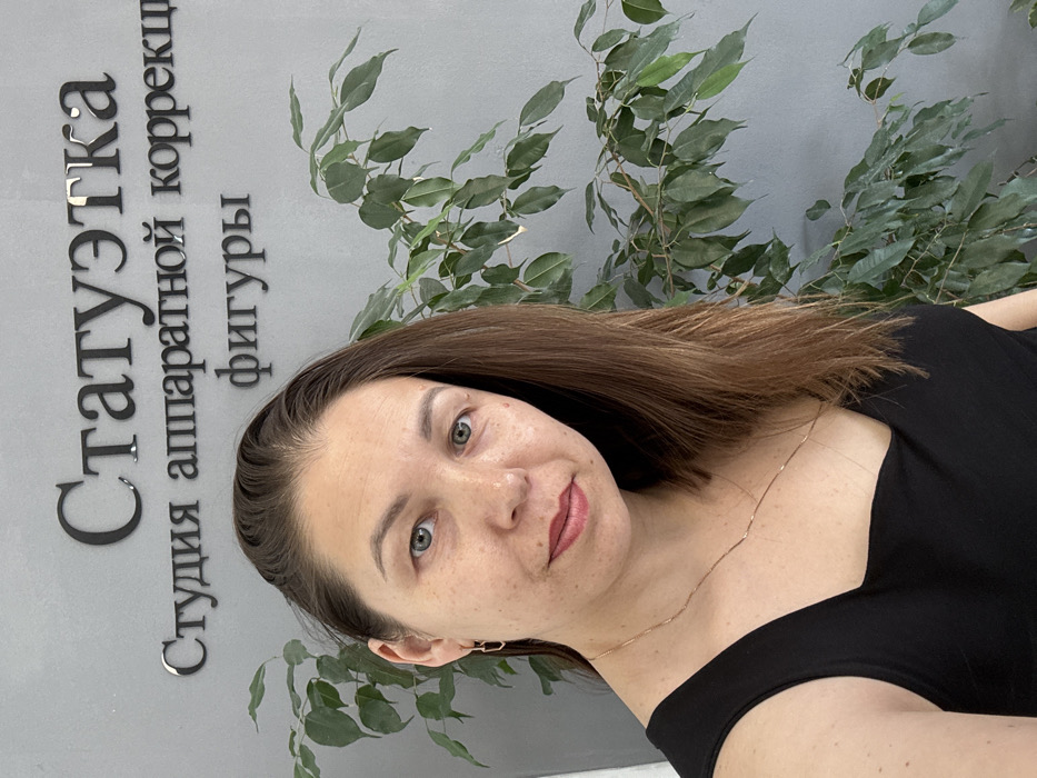 A woman with light brown hair, light eyes, and fair skin is depicted in a portrait-style photograph. She is wearing a black sleeveless top, a thin gold-colored necklace, and small, geometric gold-colored hoop earrings. Her lips are tinted red, and she is looking directly at the camera. She stands indoors against a plain grey wall. To her right, a large green leafy plant is visible. On the wall, black three-dimensional letters spell out "Статуэтка" (Statuetka), with "Студия аппаратной коррекции фигуры" (Studio for Apparatus Body Correction) written below it. The location is an indoor establishment, likely a beauty or body contouring studio, in Chaikovsky, Russia.