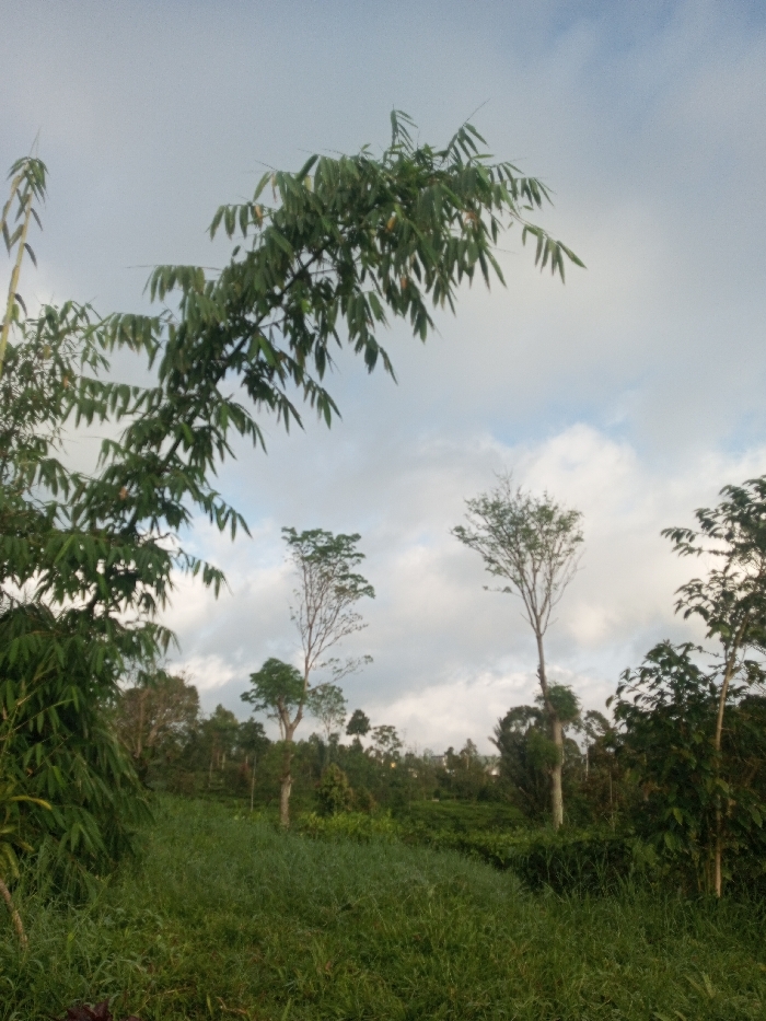 A serene landscape unfolds with tall grass in the foreground leading to a gentle slope dotted with trees. Lush green foliage dominates the left side, contrasting with the slender, almost bare trees scattered across the hillside. The sky above is partly cloudy, casting a soft, diffused light over the scene. The overall impression is one of tranquility and natural beauty.