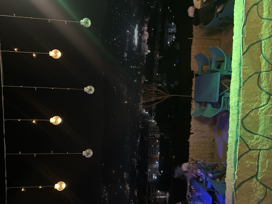 The photo shows an elevated outdoor dining space overlooking a city at night. Strings of decorative lights hang to the left, illuminating blue chairs and tables along a textured wall on the right. Distant city lights twinkle across the dark cityscape. A bamboo fence partially obscures the view, and a whimsical decorative tree sits near the table area. A person with a hookah sits at a table at the bottom.