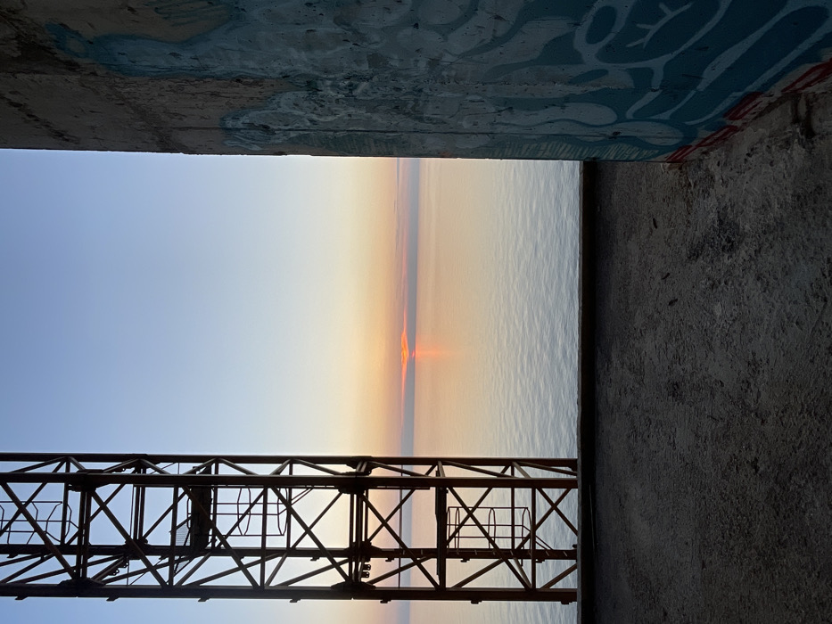 The image depicts a sunset over a body of water in Perazića Do, Montenegro, framed by industrial infrastructure. The foreground presents a dark, coarse concrete surface, partially obscured by a dark horizontal edge. To the left, a tall, weathered, reddish-brown metal lattice structure, possibly a crane or scaffolding, ascends vertically, showcasing multiple internal rungs and crossbeams. To the right, a textured concrete wall, extensively covered in light blue and white graffiti with some red markings at its base, frames the scene vertically. Between these structures, a calm body of water extends to the horizon, reflecting the soft light of the setting sun. The sun, partially visible above the horizon, displays a prominent orange-red glow, casting a bright reflection on the water's surface. The sky transitions from a warm orange and yellow near the horizon to a clear light blue overhead. No individuals or active subjects are present.