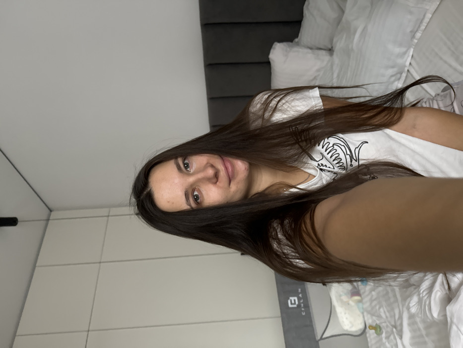 The image depicts an interior bedroom scene in Akulovo (Gp Kubinka), Russia. A female subject, appearing to be in her 20s or 30s, with long, dark brown hair and a light complexion, is positioned centrally, looking directly at the camera with a slight smile. She is wearing a white V-neck t-shirt with a dark graphic design on the front. Her right forearm is visible in the lower-left foreground, indicating she is holding the camera for a selfie. To the subject's left, a light-colored, paneled wardrobe is visible against a white wall. Below this, a dark grey portable crib or playpen, bearing the white text "CINLAN," contains a white sheet, a white pacifier, and a small, colorful toy. To the subject's right, a bed is present with white bedding, including a duvet and pillows. The bed features a dark grey, possibly upholstered, segmented headboard. The ceiling is white, and a black cylindrical pendant light fixture is visible in the upper-left portion of the frame. The room exhibits a modern, minimalist aesthetic.