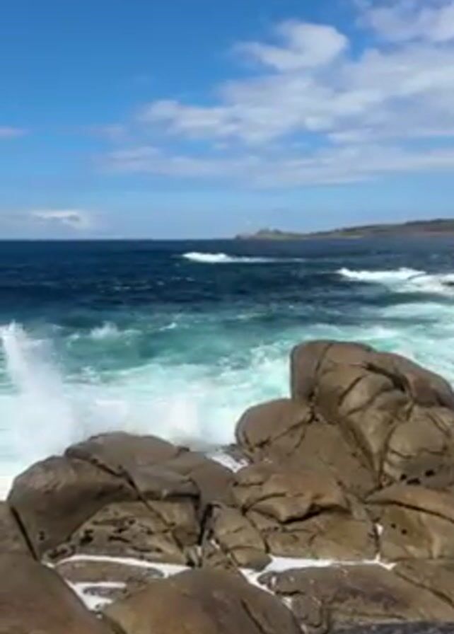 ocean waves crashing against a cluster of large, rounded rocks. The water is a mix of deep blue and turquoise, with white foam and spray from the crashing waves. The sky is bright blue with scattered white clouds. The horizon includes a headland in the distance.