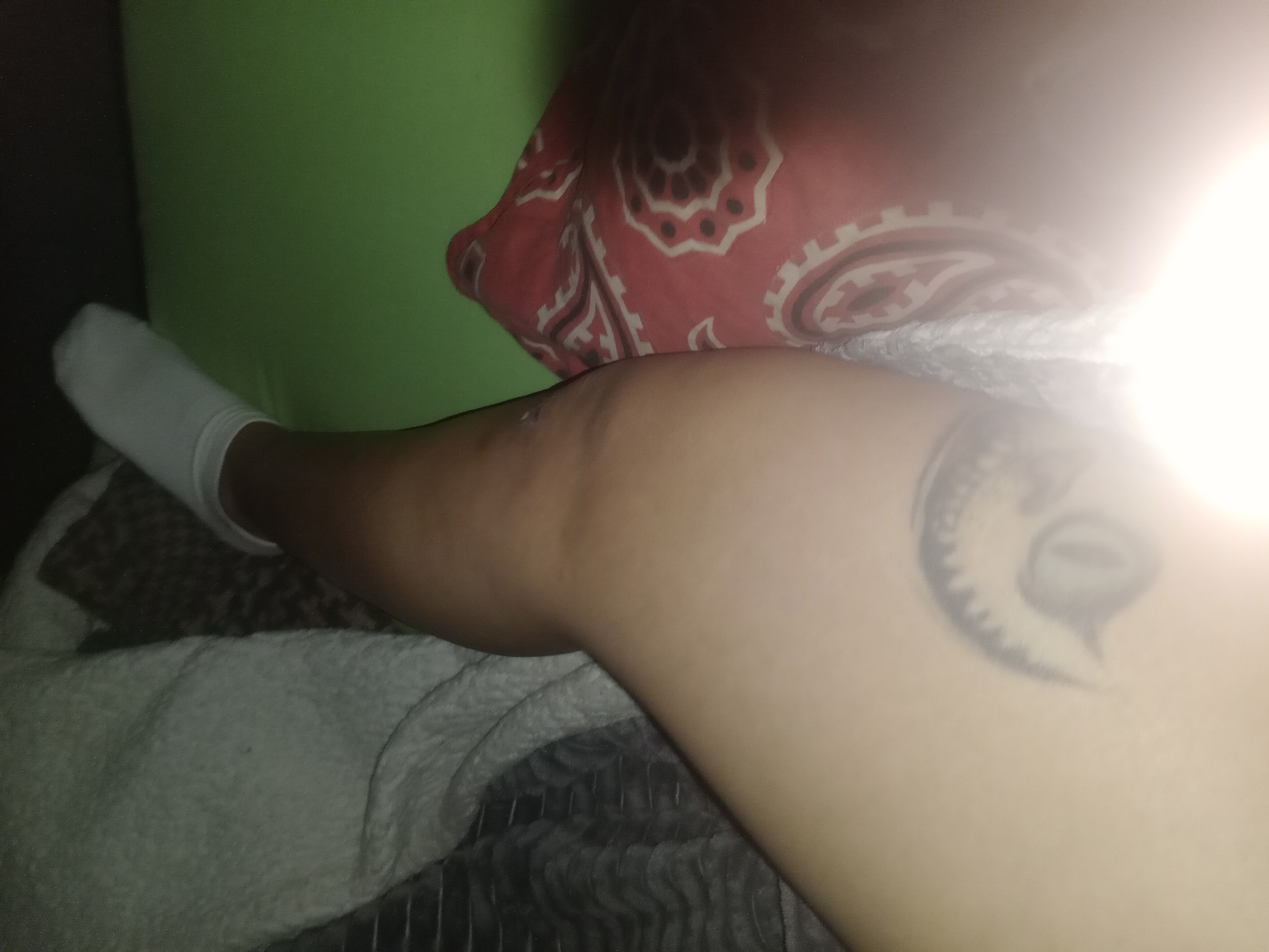A person's leg is visible, lying on a bed or sofa. The person is wearing a white sock on their left foot. A tattoo is visible on the right thigh. The leg is resting against a red patterned pillow and a light green pillow. A white blanket is beneath the leg. The location is unknown, but the query mentioned Villa Ballester Noroeste, Argentina.