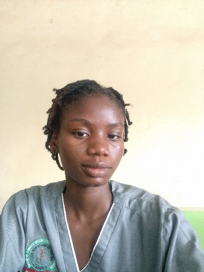 A female subject, appearing to be of African descent, with dark skin and black, short, twisted hair, is depicted in a chest-up portrait. She wears a grey medical scrub top with a white V-neck trim. A circular embroidered patch is affixed to the left chest area of the scrub top, bearing the text "GLOBAL ASSOCIATION FOR HEALTH STUDENTS (GAHS)" and "FEDERAL MEDICAL CENTER KEFFI (FMC KEFFI)". Her expression is neutral, and she directly faces the camera. The background consists of a plain, light beige wall. The scene is located at the Federal Medical Centre in Keffi, Nigeria.