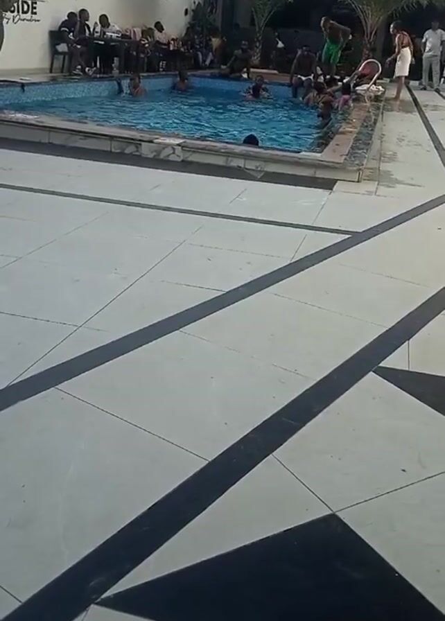 The video depicts an outdoor swimming pool area with a group of people. Some are in the pool swimming, while others are seated at tables alongside the pool. A person in a white dress stands at the edge of the pool. The pool is surrounded by a tiled area with a geometric pattern in black and white. There are palm trees and a partial awning visible, with a mountain in the background. A sign on the wall reads "The Better Poolside."