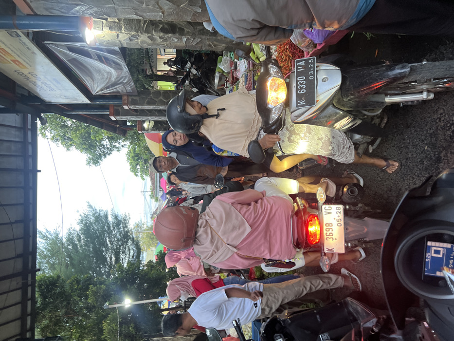 This image depicts a congested street scene, likely a market area, in Kecamatan Pati, Indonesia