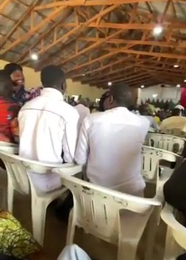 gathering of people in a large room with a wooden ceiling supported by beams. Most of the attendees are seated on white plastic chairs, generally facing the same direction, away from the camera. Some people in the foreground are wearing white shirts. In the distance, there are green, white, and red decorations. At least one person is interacting with others in the crowd. There is music playing in the background. The camera view is from a seated position and slightly obscured.