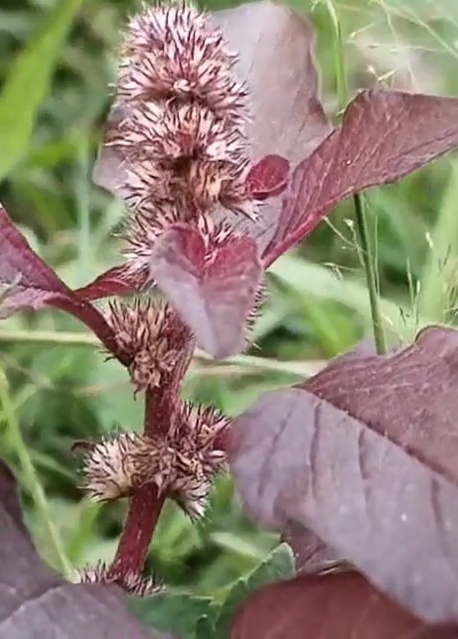 close-up of a plant with maroon leaves and a spiky, white and maroon flower head. The plant is surrounded by green grass and other foliage. The camera is stable, and there is no sound.
