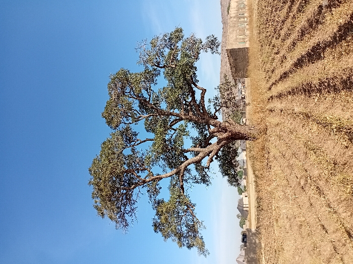 The scene depicts an outdoor landscape under a clear, bright blue sky in the city of Unknown, Unknown. A large, mature deciduous tree with a thick, gnarled trunk and extensive green foliage stands prominently in the middle ground, slightly to the left of center. The foreground consists of a dry, tilled field, light brown to tan in color, with distinct furrows running diagonally from the lower left to the middle right. Sparse, dry vegetation is scattered across the ground. In the background, to the left, are several single-story buildings with dark roofs and light-colored walls, indicative of a settlement. To the right of the tree, a long, rectangular, light-brown building with multiple vertical openings or recesses is visible. Beyond this building, a range of low, brownish-green hills or mountains extends towards the horizon. No individuals are present, and no actions or interactions are depicted.