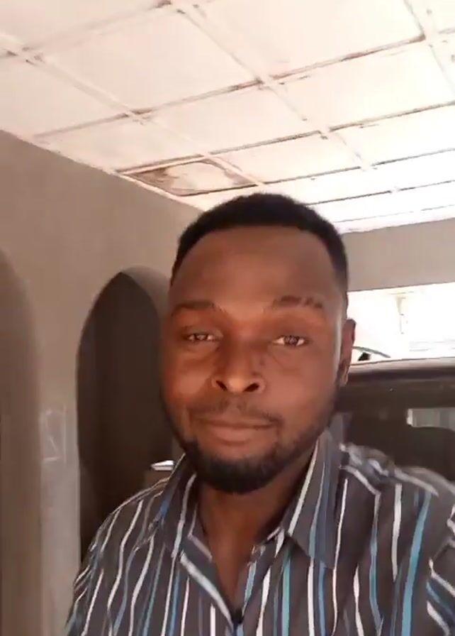 A man wearing a striped shirt is standing outside, looking at the camera. He makes a gesture that resembles a hand symbol. He then squints his eyes and laughs. The background includes a car, a window, and a textured ceiling.