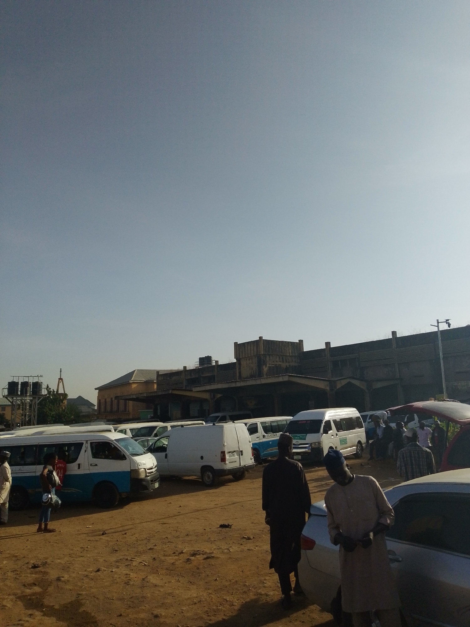 The image depicts an unpaved motor park at the Jos Terminus, Jos, Nigeria, against a backdrop of the historic Jos railway station building