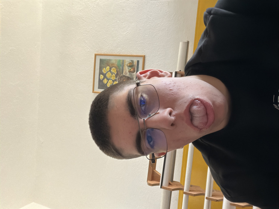- "A young male with a buzz cut and metal-framed glasses is depicted in a close-up, facing the camera with his tongue extended" by FM-2U2UI3, licensed under CC BY 4.0