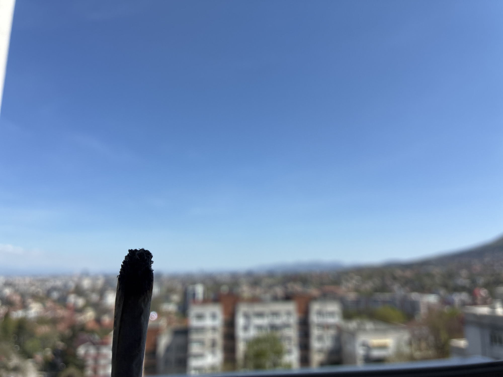A lit cigarette is in the foreground, partially obscuring the cityscape of Sofia, Bulgaria, under a clear blue sky. The city is blurred and appears to be observed from an elevated position within a building, indicated by the window frame visible along the bottom. The distant mountain range is faintly discernible on the horizon.