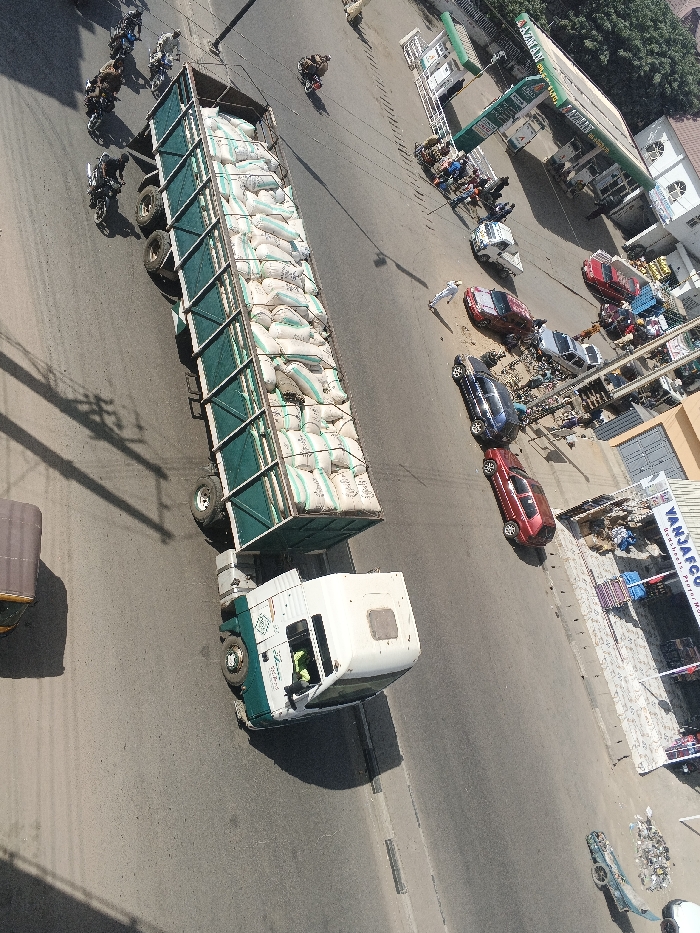 An elevated, overhead view captures a busy street scene in Fagge A, Nigeria, under clear daylight conditions. A large white and green articulated truck, laden with numerous white sacks stacked in its open trailer, is positioned centrally on the asphalt road, facing towards the lower-left. A driver wearing a high-visibility vest is visible in the cab of the truck. Several motorcycles, some with riders, are present near the front of the truck on the road. To the right of the truck, a gas station with a prominent green canopy labeled "AZZAN" is visible, featuring fuel pumps and associated structures. Multiple passenger vehicles, including red, dark blue, and white cars, are parked along the roadside near the gas station. Further right, a commercial strip includes buildings, one displaying a "VANJAFCO" sign, with various goods and debris accumulated on the sidewalk. Pedestrians are visible on the street and sidewalks, including an individual in a white garment standing near the parked cars. Overhead wires and their shadows are cast across the scene, along with distinct shadows from vehicles and buildings, indicating a high sun angle. A brown three-wheeled vehicle is partially visible on the far left.