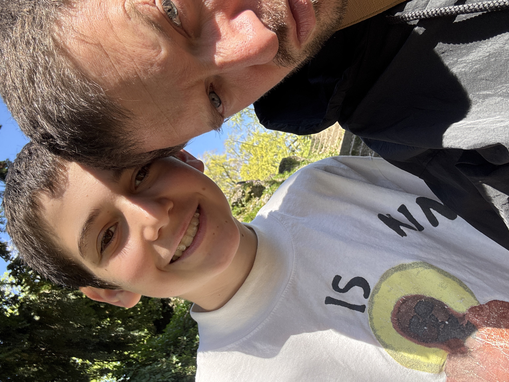 A selfie shot from a low angle captures two individuals outdoors. The person in the foreground is a young person with short, dark hair, smiling broadly, and wearing a white t-shirt with a design and partial text. The person behind them is an adult with graying hair, light eyes, and a short beard. The adult is wearing a dark jacket. The background shows greenery and a blue sky. The t-shirt design of the young person appears to be depicting the painting of Madonna of the Chair. Thus, the location may be Milan, Italy, possibly in the vicinity of the Pinacoteca Ambrosiana that features the painting.