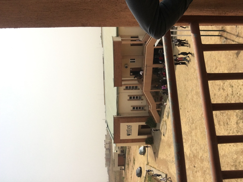 The image depicts an elevated view of an outdoor institutional area in the city of Minna, Nigeria, under a pale, hazy sky