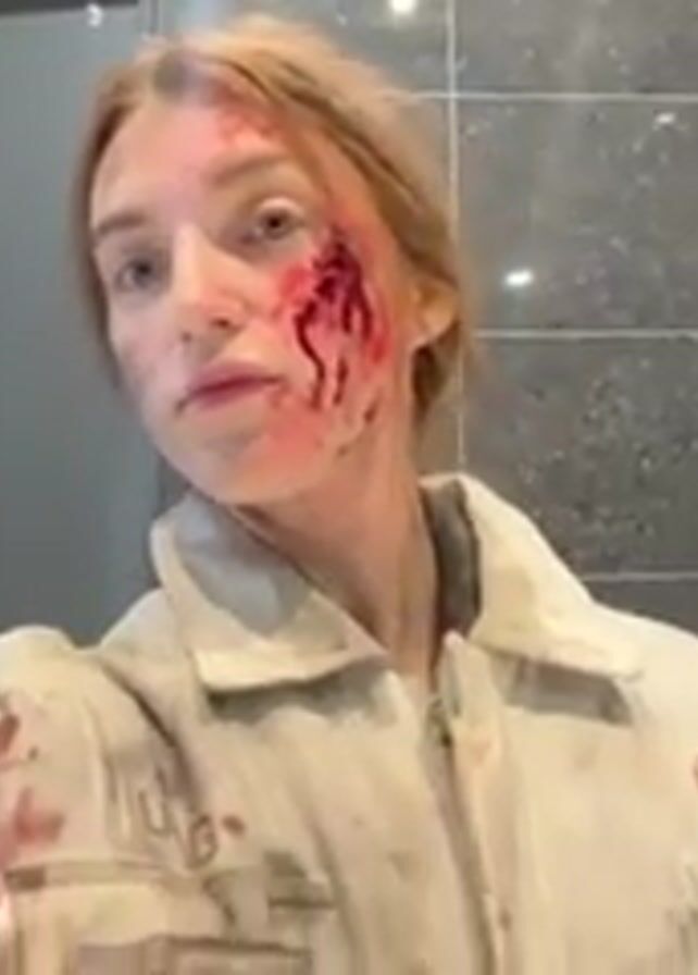A woman with fair skin and reddish hair, wearing a white jumpsuit and name tag, stands in a public restroom. She has fake blood and makeup wounds on her face, particularly near her left eye and cheek. She touches her hair briefly and then poses with her fingers slightly apart, looking directly at the camera. The restroom has gray tile walls, a metal door, and a red-colored partition partially visible on the right. A toilet paper dispenser is visible on the wall behind her to the left. A sound can be heard in the background.