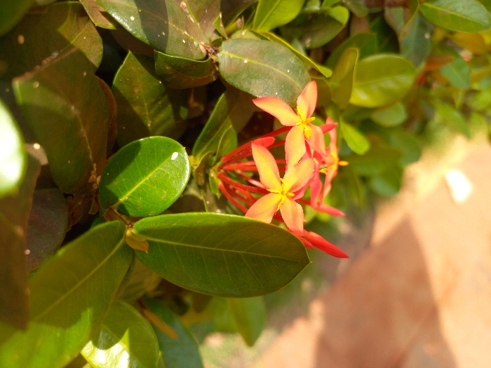 - "A close-up, slightly tilted photograph taken in Oturkpo, Nigeria, displays a cluster of small, four-petaled flowers, predominantly orange-red with yellow centers, emerging from a dense mass of ovate, glossy green leaves" by FM-dSFJt1, licensed under CC BY 4.0