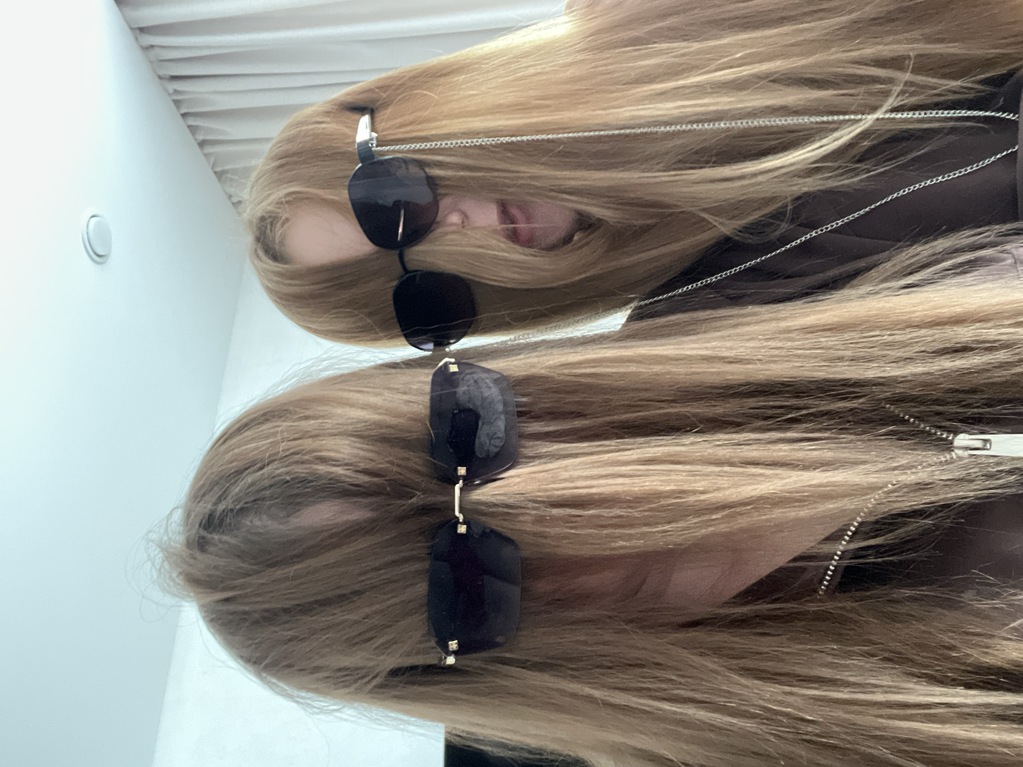 A photograph shows two women, possibly twins, with long blonde hair and sunglasses. The women are positioned one above the other, with their faces partially obscured by their hair and sunglasses. The background appears to be a light-colored wall or ceiling. Other details visible include a silver chain attached to one of the pairs of sunglasses and a zipper on a dark-colored garment. Based on the user's prompt, the image is likely taken in Chaikovsky, Russia.