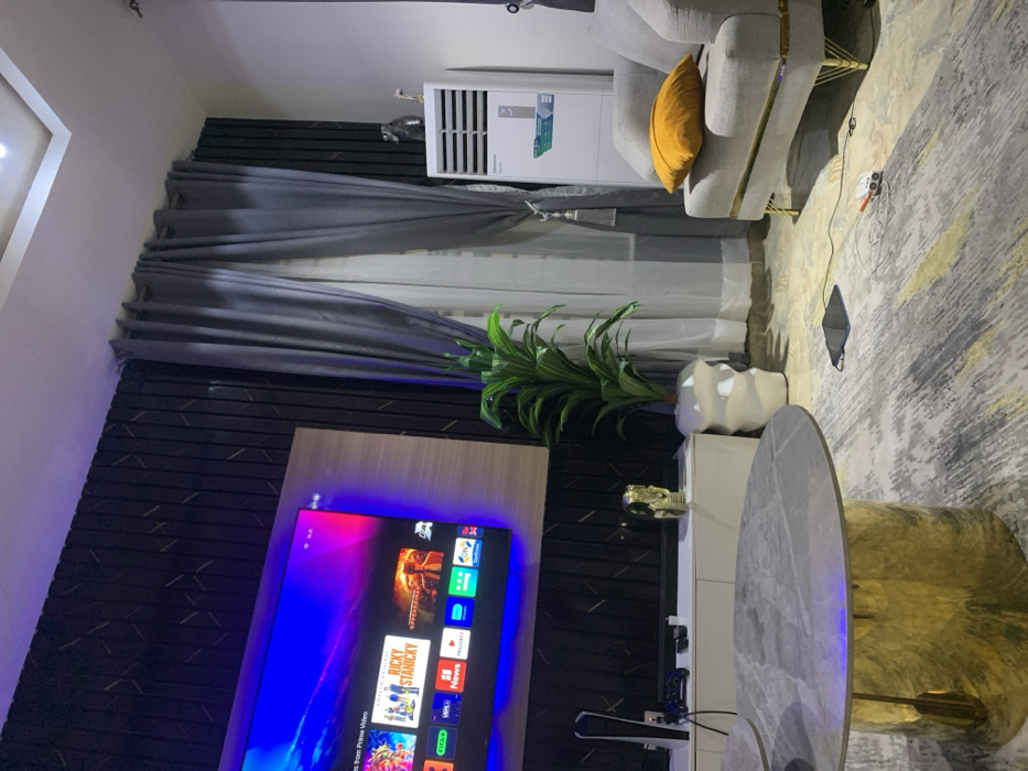 A modern living room features dark paneling on one wall with gray and white curtains. A large television screen displays colorful content. A floor-standing air conditioner stands next to a gray armchair with a yellow pillow. A white console table with a plant and decorative items sits near a gray and gold coffee table. A patterned rug covers the floor.