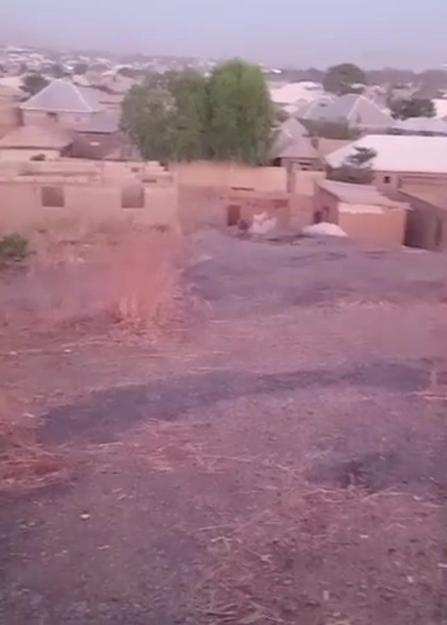 landscape with multiple small buildings, some under construction, in what appears to be a residential area. The foreground consists of dry, brown vegetation and a dirt or gravel path. The buildings are predominantly single-story structures with various roof styles, some with metal sheeting. In the distance, more buildings and a hazy skyline can be seen. There are no visible people or significant actions taking place in the video.