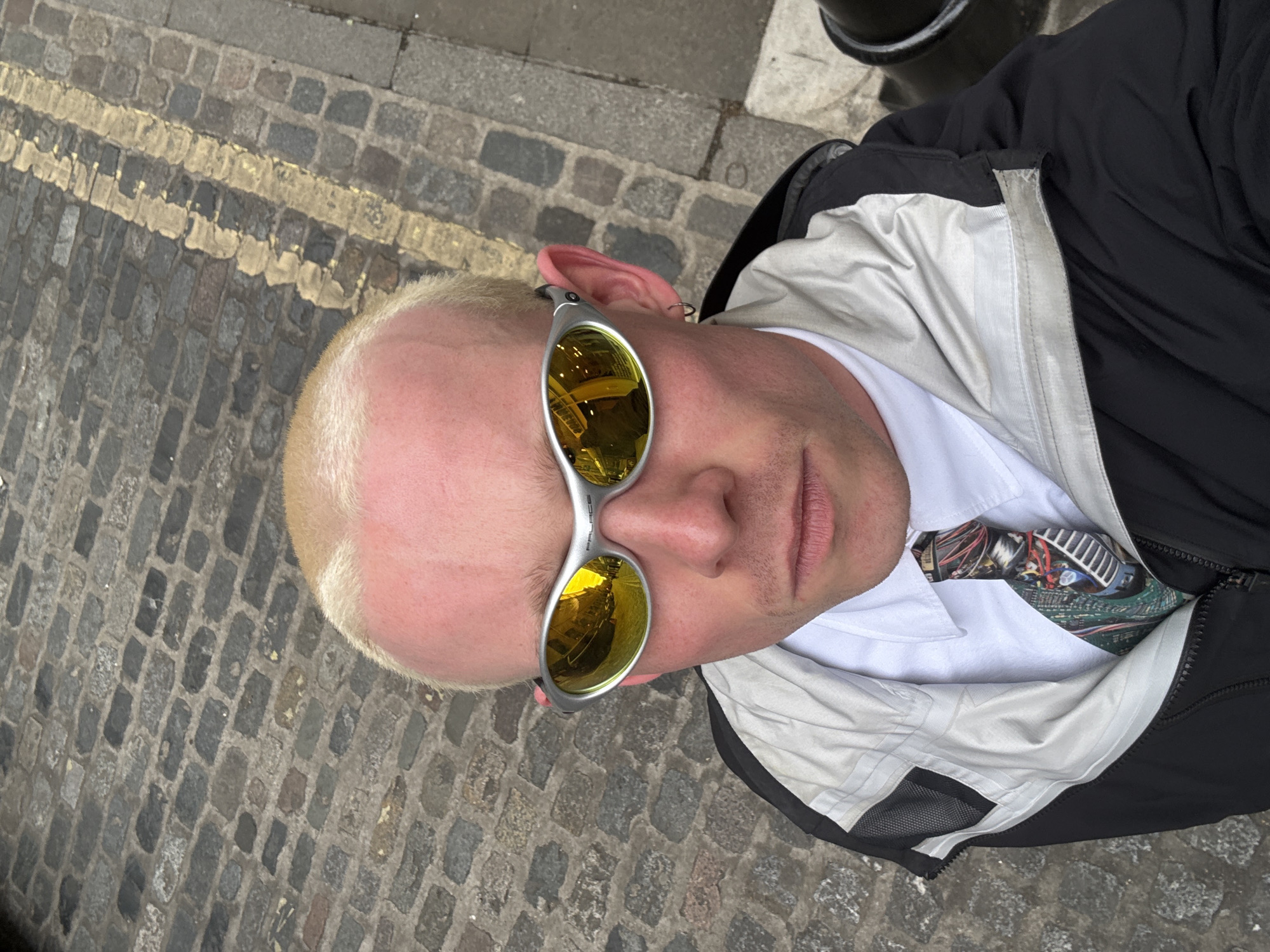 A man wearing a white shirt, a circuit board-patterned tie, and Palace sunglasses is seen at street level, with cobblestone pavement and a yellow line visible. The location is in London, United Kingdom, based on the type of street markings and cobblestones. The man is wearing a black and light grey hooded jacket. The photo appears to be a selfie.