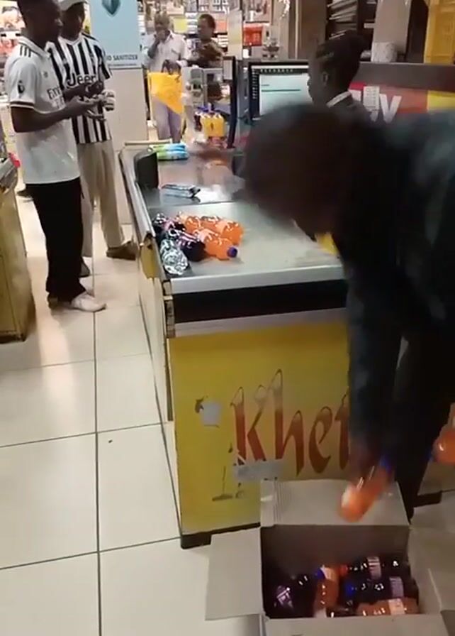 supermarket checkout. A person wearing a black jacket and dark pants is placing bottles from a cardboard box on the checkout counter. The bottles are a mix of orange and dark colored liquids. The checkout counter has "Khetia" printed on the front. A cashier is behind the counter, operating the computer. Two other men are standing near the checkout, appearing to be customers. One of the customers is wearing a white and black striped shirt and holding something in his hand, possibly a phone. The supermarket has tiled floors. There is a hand sanitizer station visible in the background.