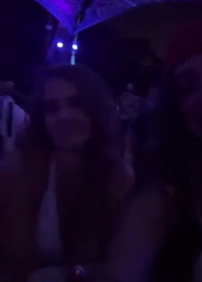 Two women are recording a video of themselves at an outdoor rave. The woman in the foreground has long curly brown hair and is wearing a red bandana. The woman behind her also has long curly hair. They are both smiling. The rave takes place at night under a canopy with blue lights. The background shows other people dancing at the rave.