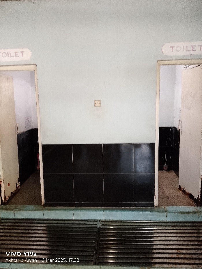 view of two toilet stalls. The stalls are located in a building, possibly a public restroom or a public facility. The stall on the left has a sign above it that reads "TOILET," while the stall on the right also has a sign that reads "TOILET." Both stall doors are open, and there is a small, square electrical outlet visible on the wall. The stalls are lined with black tiles, and a light blue tile trim separates the black tiles from the pale blue wall. There is a stainless-steel drainage grate in the floor in the middle of the image. The image is taken from a slightly elevated perspective. The location of the image is in Kecamatan Gabuswetan, Indonesia, at latitude -6.44 and longitude 108.027. There are no people visible in the image.