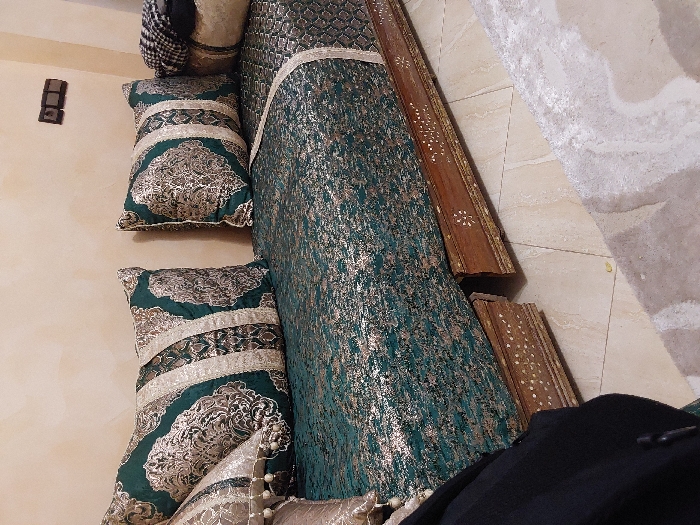 A richly textured scene features cushions and bedding in shades of green, gold, and brown. Ornate patterns adorn the cushions, and a section of wooden frame with inlaid designs runs along the edge. A portion of a light-colored rug is visible in the upper right, and a black garment or cloth lies in the lower right, partially obscuring the scene. A light tan wall serves as the backdrop.