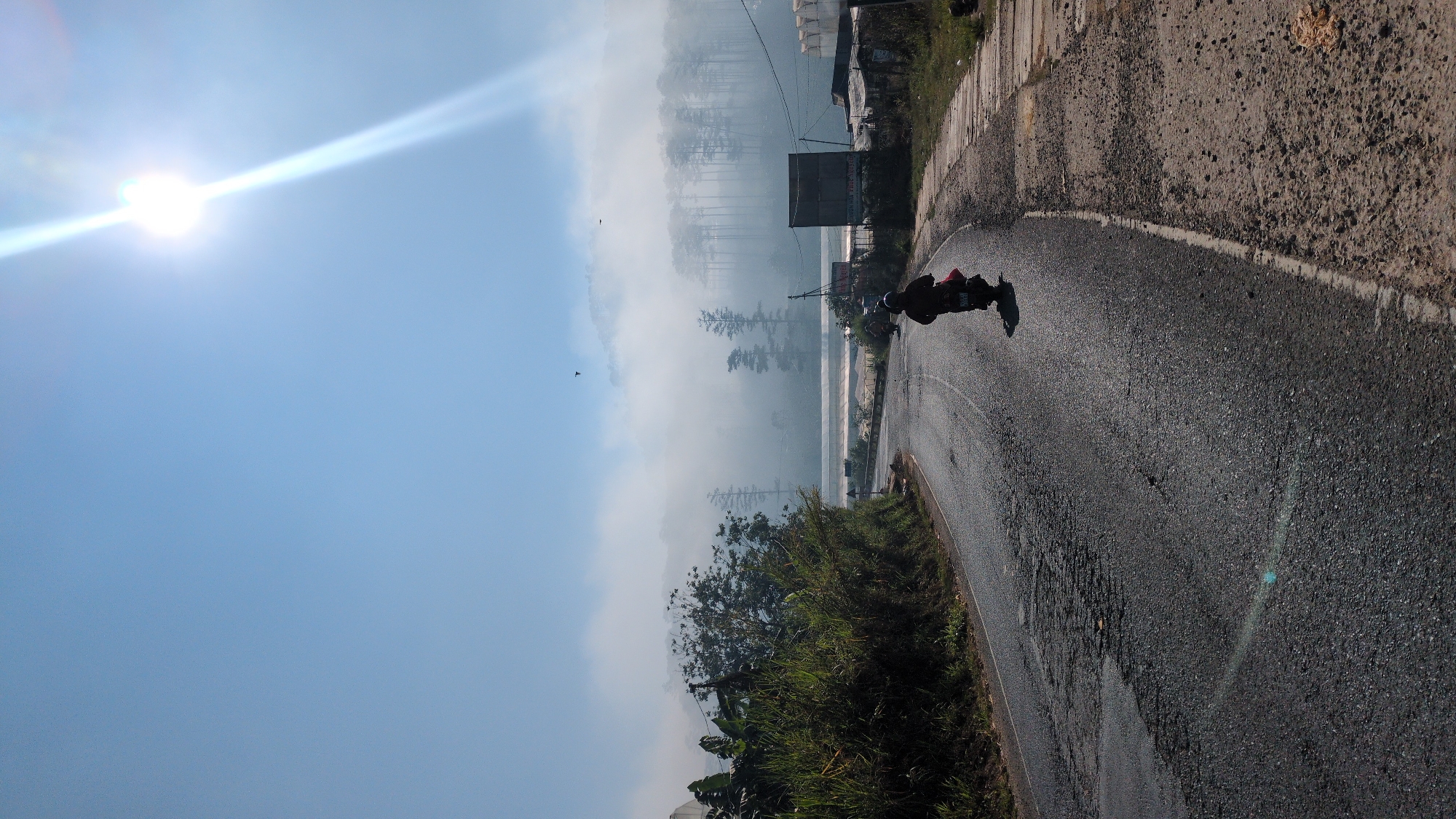 The image captures a curved asphalt road receding into a misty landscape within the city of Thôn 4, Vietnam. The sky overhead is clear blue, with a bright sun positioned in the upper right quadrant, emitting a strong lens flare. The dark asphalt road surface exhibits extensive cracking and patching. A single individual, observed from the rear, rides a dark scooter or motorcycle away from the viewer along the curve; the rider wears a dark helmet and dark clothing, with a red object secured to the rear of the vehicle. A second, less distinct motorcycle is visible further down the road, partially obscured by mist. The road's right edge features an unpaved gravel shoulder that transitions into a rough, irregular path. The left side of the road is bordered by dense green vegetation, including tall grasses and broad-leafed plants, with a dark-foliage tree visible behind them. Beyond the immediate foreground, a thick layer of fog or mist blankets the middle and background, obscuring the lower sections of distant hills and rendering tall, slender trees as dark silhouettes. In the mid-distance on the right, structures resembling greenhouses are partially visible, along with a white horizontal barrier. Two small, dark bird-like shapes are discernible against the clear sky above the mist.