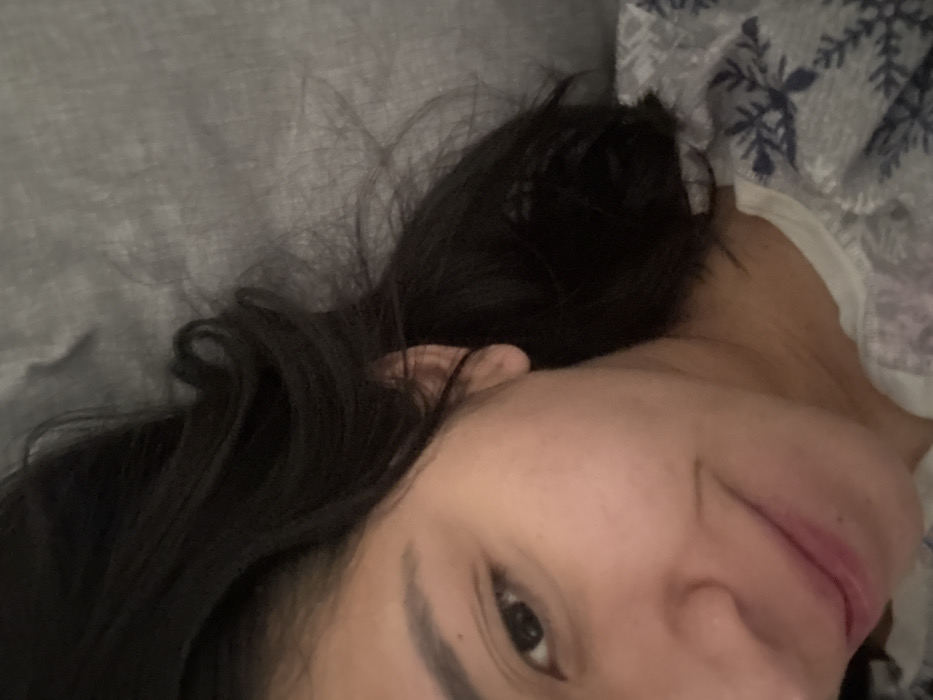 The image displays a close-up view of an individual, appearing female, in a reclined position
