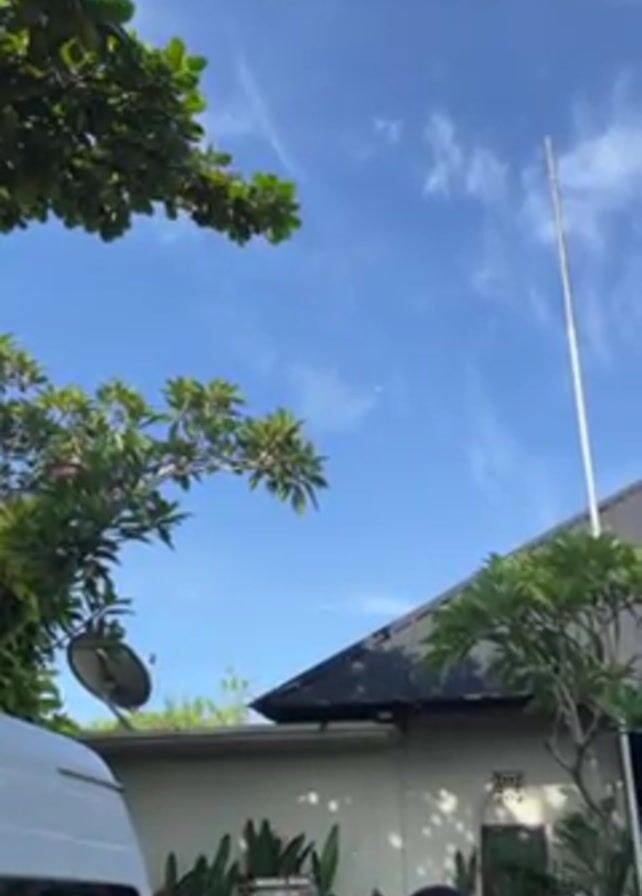 The camera pans upwards, starting from a scene that includes a white van, a building with a dark roof, trees, and a signpost indicating directions, ultimately focusing on a daytime sky featuring a crescent moon and thin, wispy clouds