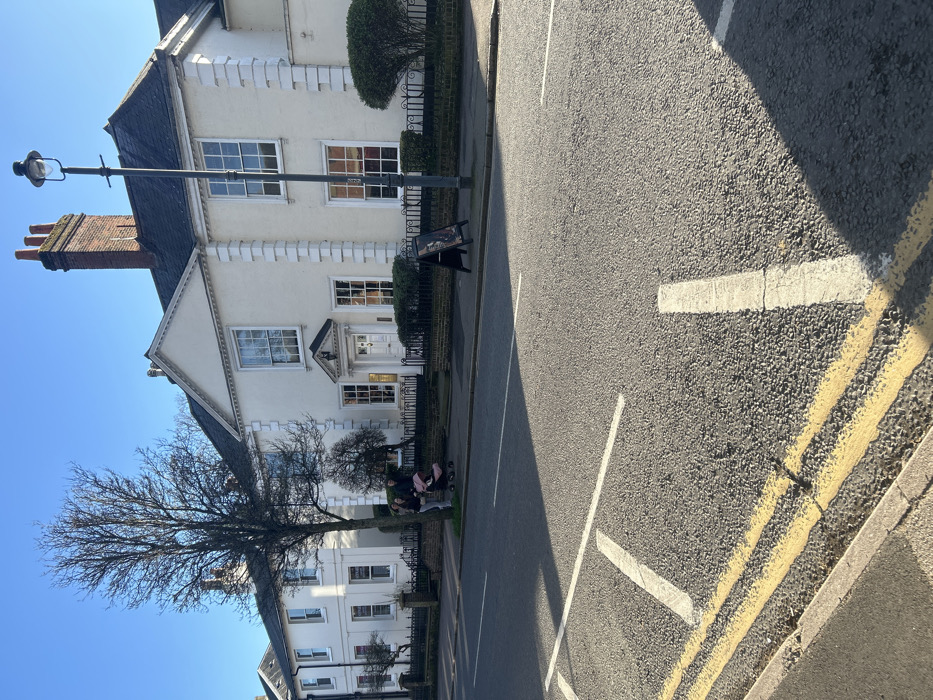 This image captures a daytime street scene in Dacorum, United Kingdom. The foreground shows an asphalt road with double yellow lines painted along the curb and several white dashed markings perpendicular to the curb. Distinct shadows are cast across the road surface. On the paved sidewalk to the left, three individuals are visible. One person is pushing a pink stroller, accompanied by two other pedestrians. A bare deciduous tree stands on the pavement near these individuals, to the left of a prominent two-story building. The background consists of several light-colored, multi-story buildings. The central structure is a large, two-story, cream-colored building featuring a classical pediment over its central entrance, multiple sash windows, and decorative white quoins on its corners. Its frontage is secured by a black wrought-iron fence and low, manicured hedges. To the right, a black lamppost with a traditional lantern-style light stands on the pavement, and a black A-frame sign is placed near its base. Further to the left, another white two-story building with sash windows and a similar fence is visible. Red brick chimneys are present on the dark roofs of the buildings under a clear blue sky.