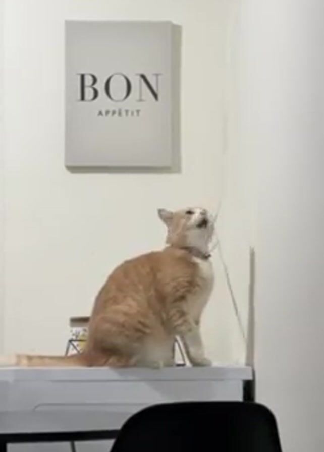 light orange cat with a collar sitting on a white table and reaching for a thin, clear string hanging down from the ceiling. The cat paws at the string, then turns and steps down off the table behind a black chair. The background includes a white wall with a framed print that reads "BON APPÉTIT" and a small green plant hanging above the print. There are a few jars sitting on the table next to the cat.