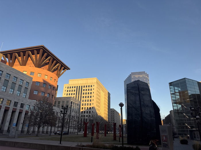 An urban landscape under a clear sky showcases a variety of architectural styles. A reddish-brown building with a distinctive overhanging roof structure stands prominently beside a gray building with vertical columns. In the background, a light-colored, block-shaped building basks in sunlight. A dark, abstract sculpture is juxtaposed with a modern glass building. Bare trees line a grassy area, accented by small, red vertical structures. The scene is bathed in the warm, early light of the day.