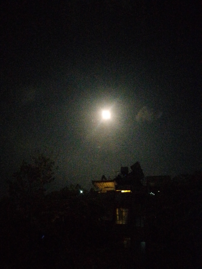 This image depicts a nighttime scene in Barza Municipality, Syria, characterized by low light and significant visual noise. The sky is dominated by a prominent, bright, and somewhat square-shaped light source, consistent with the moon, appearing diffused through atmospheric haze or light cloud cover. Below the horizon, dark silhouettes of trees or dense vegetation occupy the lower-left and central portions of the frame. In the midground, multiple building structures are visible as dark silhouettes against the faint ambient light. One central building exhibits a flat rooftop with several indiscernible objects, potentially satellite dishes or water tanks. A distinct, rectangular yellow-orange light emanates from a window or opening on this structure. Below and slightly to the right, a lower-level window emits a fainter, warm artificial light. No individuals, discernible actions, or interactions are visible.