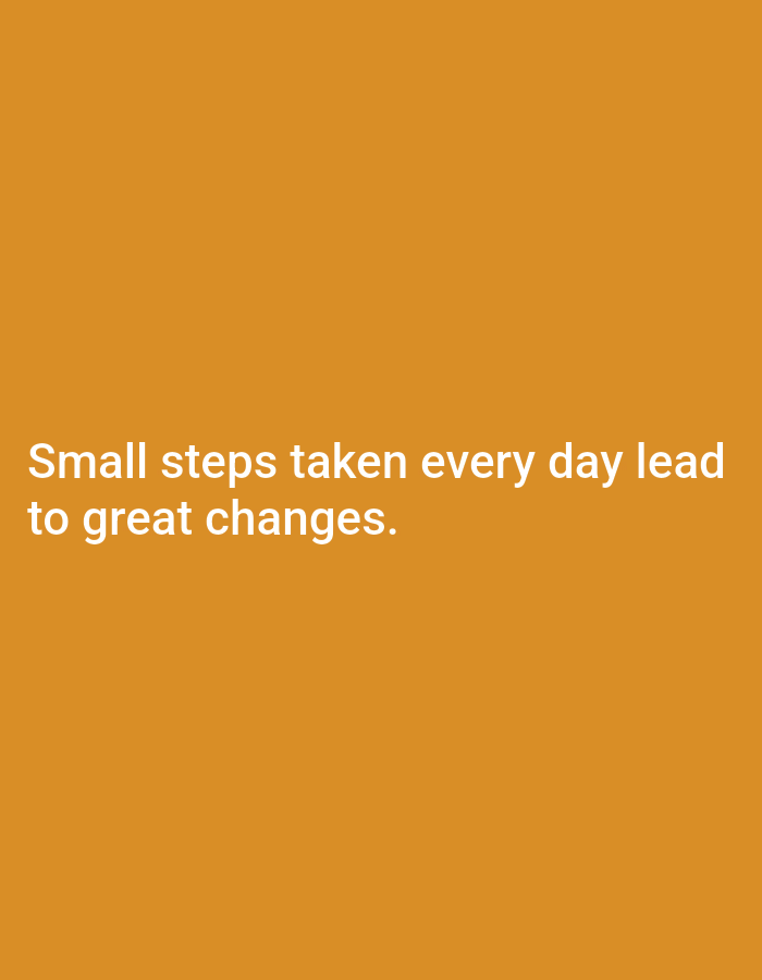 The image consists of a solid orange background. White sans-serif text is centrally aligned and positioned in the lower half of the frame. The text reads: "Small steps taken every day lead to great changes." There are no discernible people, subjects, objects, actions, interactions, or environmental features present within the image, and no visual information indicating a specific location in the city of Novo Delchevo, Bulgaria.