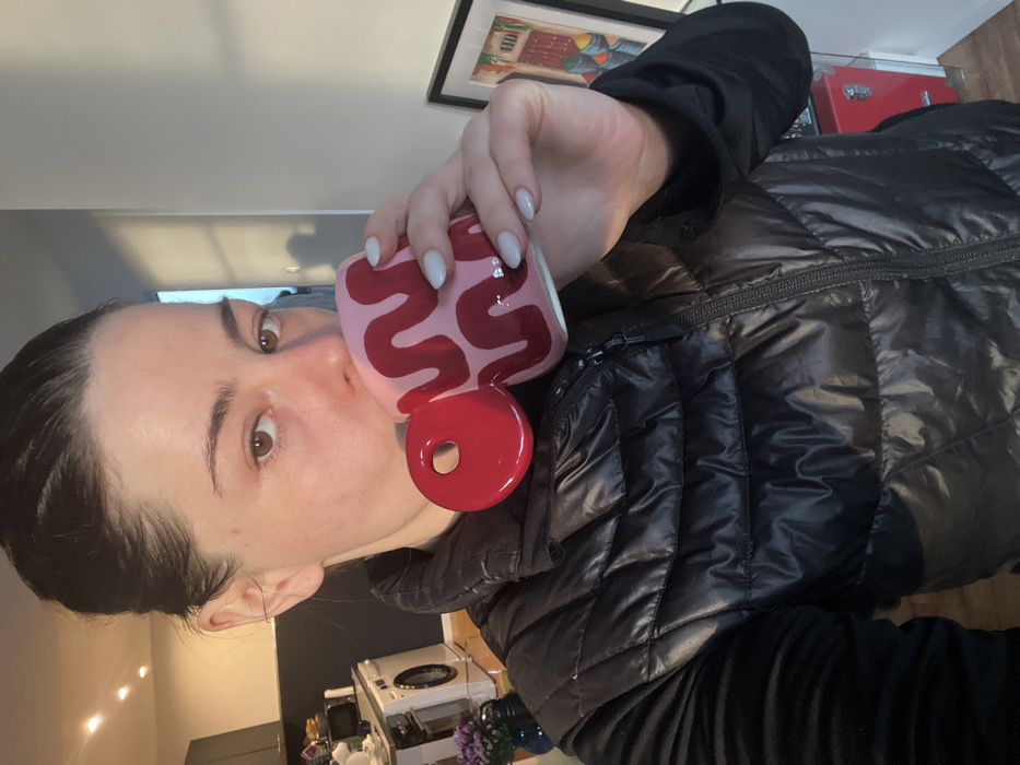 A person in a black puffer jacket holds a pink and red mug to their lips. The mug has a wavy red design and a large, rounded red handle. The person has fair skin, brown eyes, and dark hair pulled back. In the background, a framed picture hangs on the wall, and a coffee machine and other kitchen appliances are visible on a countertop. The image is rotated to the left.