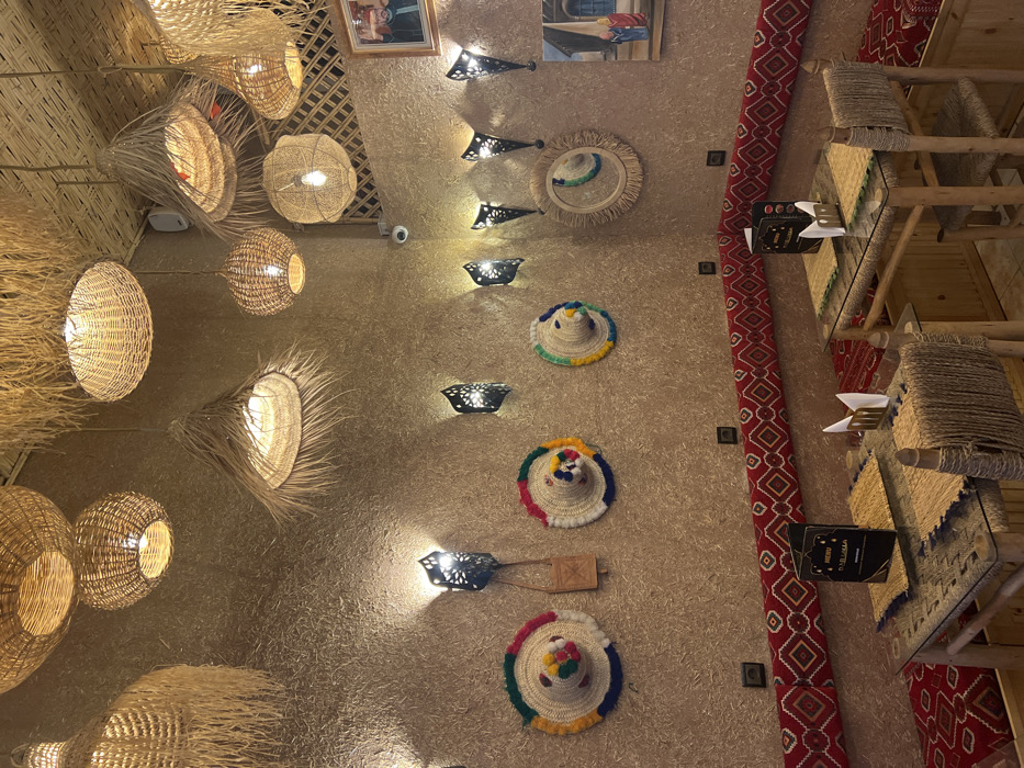 A room's interior features a warm, rustic aesthetic. Straw-woven light fixtures hang from the ceiling. The walls are adorned with woven hats and decorative mirrors, punctuated by sconces. A patterned red runner separates the wall from several tables and woven chairs. Wooden structures are visible in the background, adding to the room's organic feel.