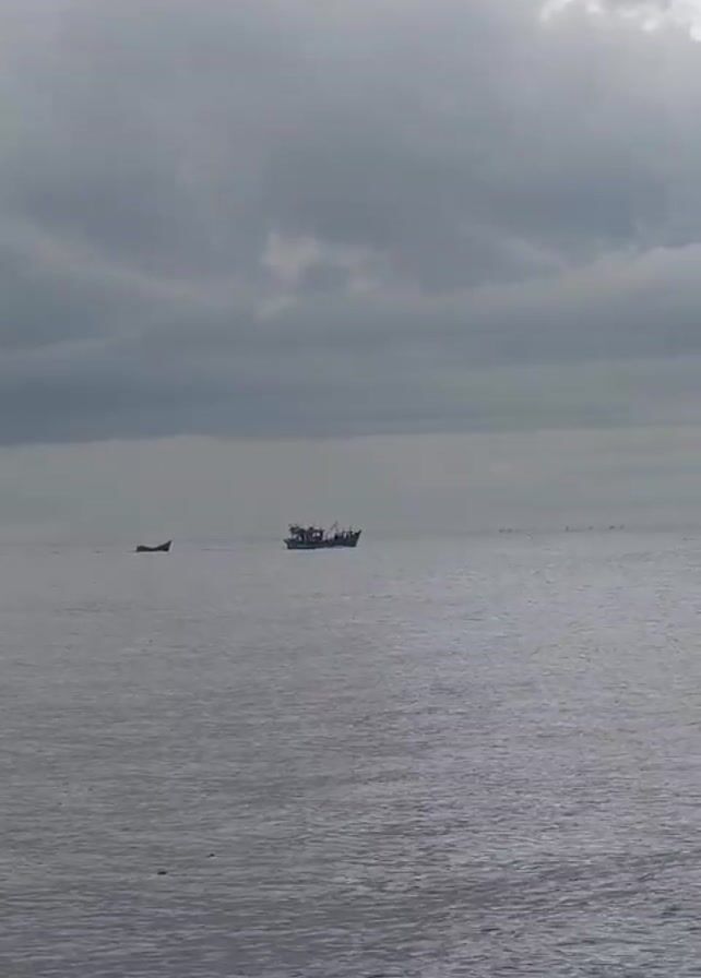 calm, gray sea under a heavily overcast sky. In the distance, there are two boats. One is a small, simple vessel while the other appears to be a larger fishing boat, possibly with crew visible. The sea itself is relatively flat with minimal waves.