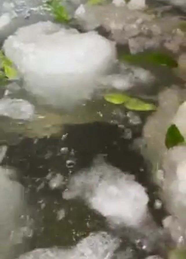 A close-up shot shows a person's hand moving around in a large metal container filled with water, ice chunks, and scattered green leaves