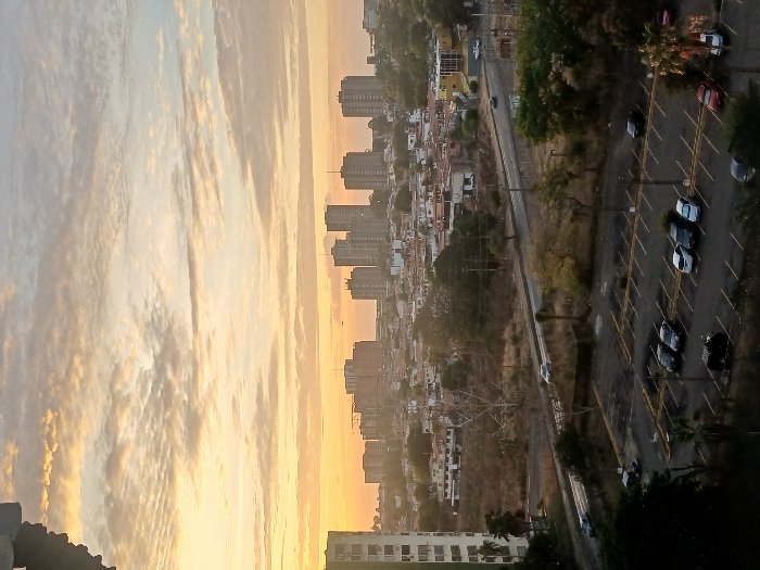 The image displays an elevated cityscape view of Ciudad Guayana, Venezuela, captured during what appears to be sunrise or sunset. The sky, occupying the upper third of the frame, features scattered altocumulus clouds illuminated with warm golden-orange and soft blue hues. In the distant background, a prominent urban skyline is visible, consisting of at least five clusters of high-rise buildings, likely residential towers, silhouetted against the bright sky. Below these, the midground is characterized by a multi-lane road or highway stretching horizontally across the scene. Several vehicles are present on this road, including at least two light-colored sedans moving towards the left and another dark vehicle. To the right of the highway, a smaller, white car is visible on a secondary road or driveway. Between the main road and the background buildings, an area of undeveloped land with dry, sparse vegetation and scattered trees is present, interspersed with lower-rise residential structures. A large metal electricity transmission tower stands in the left-center midground. On the far left, a multi-story, light-colored building, possibly an apartment complex, is partially visible, extending upwards from the lower-left corner. The foreground is dominated by a dark asphalt parking lot, clearly marked with numerous white painted parking spaces. Approximately 15 to 20 vehicles of various models and colors (including black, white, grey, and red) are parked within these spaces. Trees and dense green foliage frame the parking lot on its periphery. No individuals are discernibly visible within the frame. A dark, angular structure, likely part of the viewing platform or building, is visible in the top-left corner, slightly obscuring the sky.
