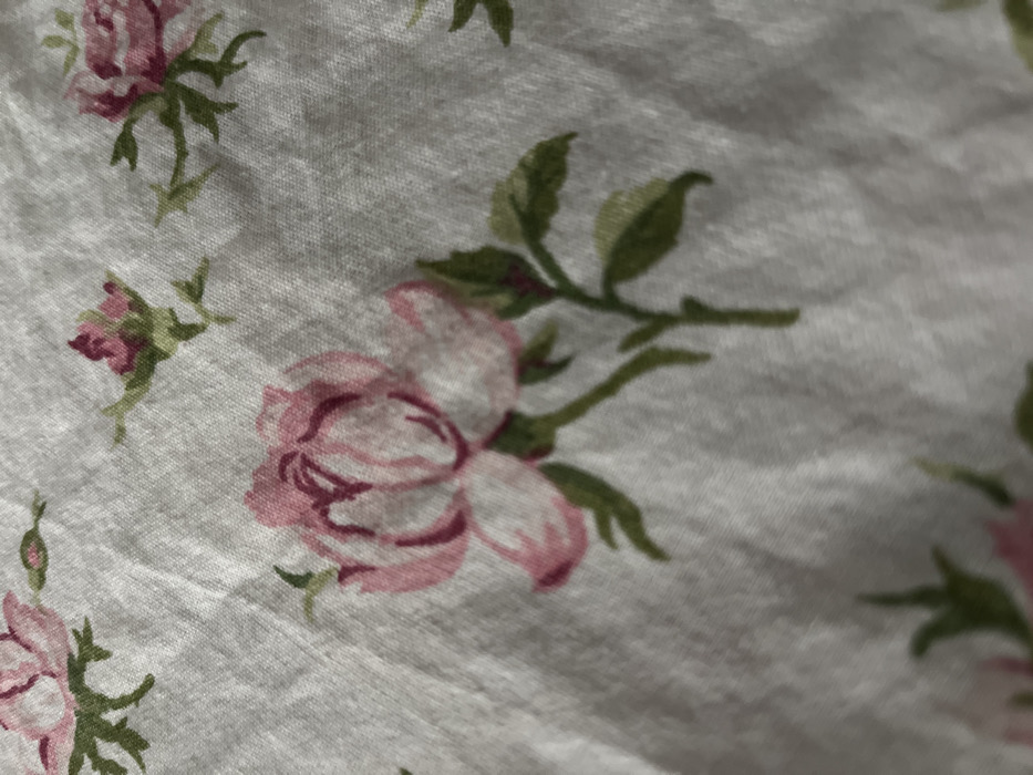 - "The image displays a close-up, top-down view of a white textile fabric patterned with pink roses and green foliage" by FM-XlCcP2, licensed under CC BY 4.0